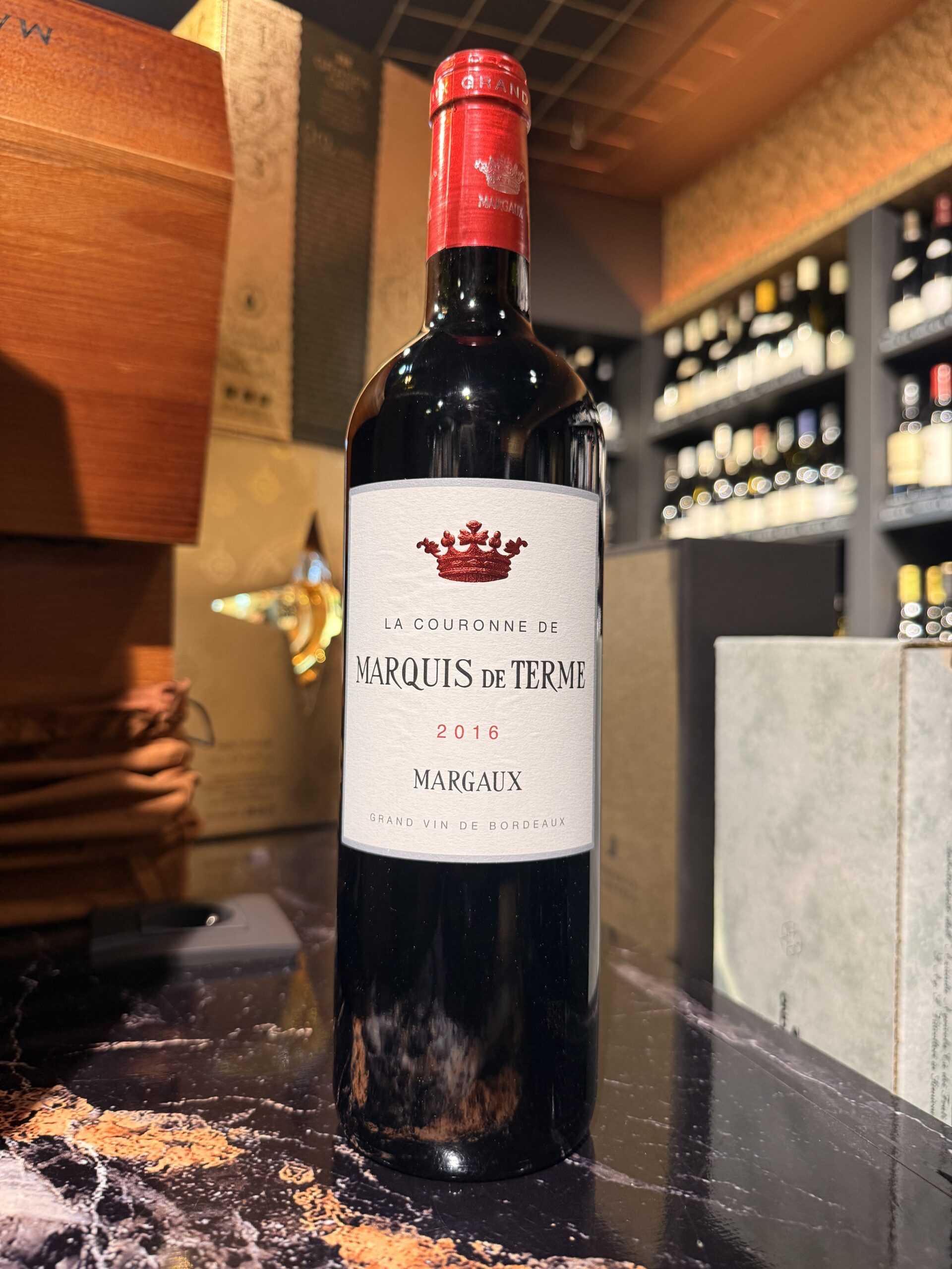 La Couronne – Marquis de Terme Margaux 2016 is de tweede wijn van het gerenommeerde Château Marquis de Terme, een historisch domein in de prestigieuze appellatie Margaux op de linkeroever van Bordeaux.